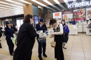 昨今の越境電子商取引の拡大により、インターネットを通じて、ニセモノとは知らずに購入してしまう被害が増えています。そこで、近鉄大阪阿部野橋駅西改札口とあべのハルカス近鉄百貨店の間のコンコースで、通行人に対し、ニセモノを購入しないよう呼びかけをおこないました。