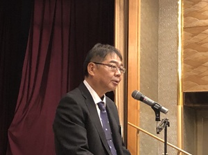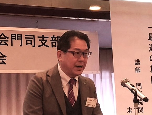 議事終了後に門司税関長 弓削 州司 氏から「最近の税関行政について」と題した講演があり、税関の3つの使命や最近の貿易動向、密輸増加、少額貨物に関する税関を取巻く状況などの説明に100名を超える出席者は熱心に聞き入っていました。