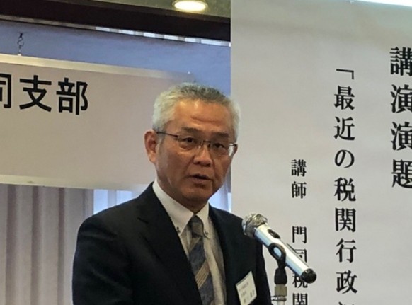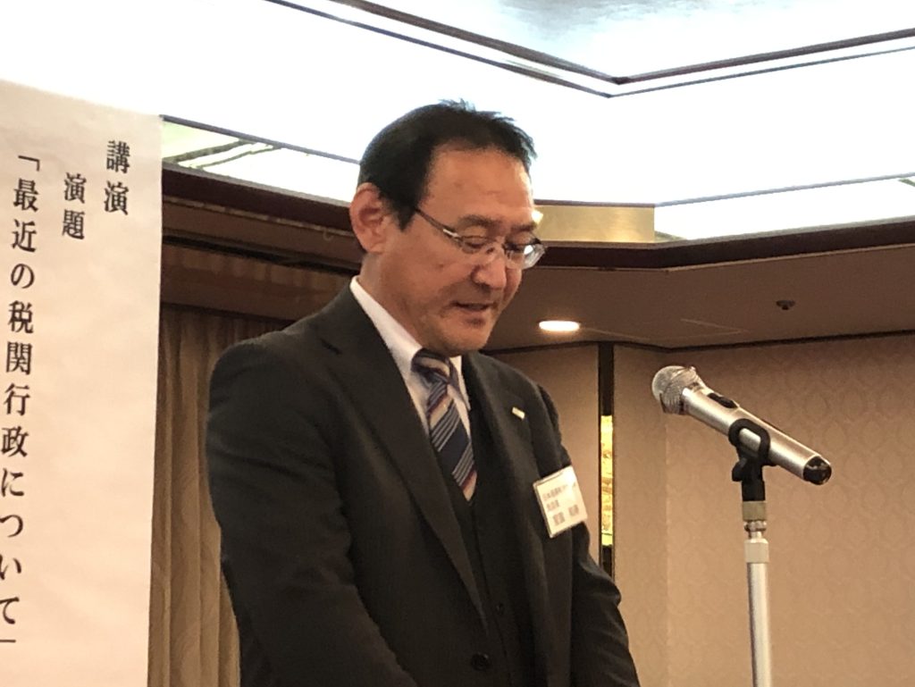その後、門司税関長 末永 広 氏による「最近の税関行政について」と題した講演会が開催され、大分県での税関官署の設置状況などから、最近の状況として電子商取引の拡大に伴いSP貨物から不正薬物の摘発が増加していること、それに対応するために関税法が改正されたことなど興味深い話があり、