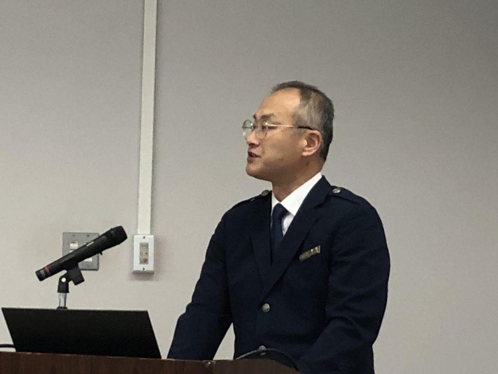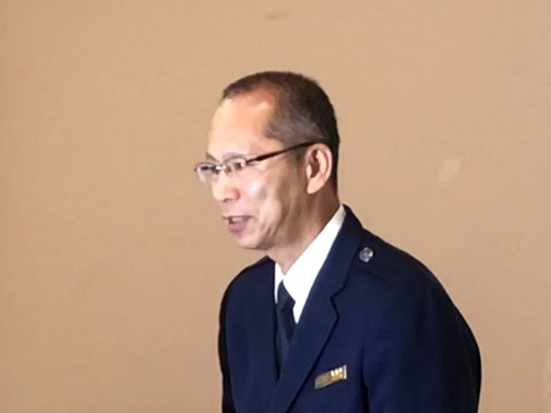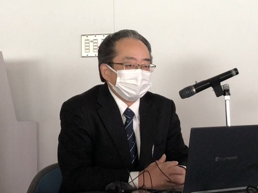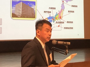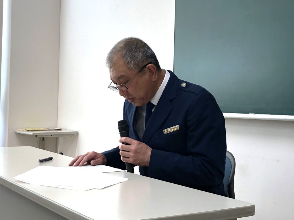 続いて、門司税関総務部長 川﨑 達也 氏から「最近の税関行政について」と題した講演が行われました。途中で田口細島支署長から支署の沿革や特徴などについて、また、多田羅油津出張所長から出張所の概要などについても説明がありました。