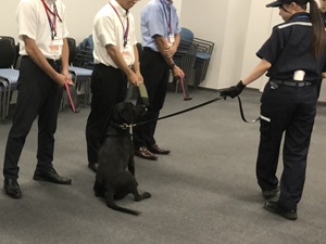 研修・見学会では、官庁棟の会議室においてCIQ各機関の業務説明、麻薬探知犬及び検疫探知犬のデモンストレーション、旅具検査場の見学を行い、最後に免税制度の説明及び免税売店の見学を行いました。