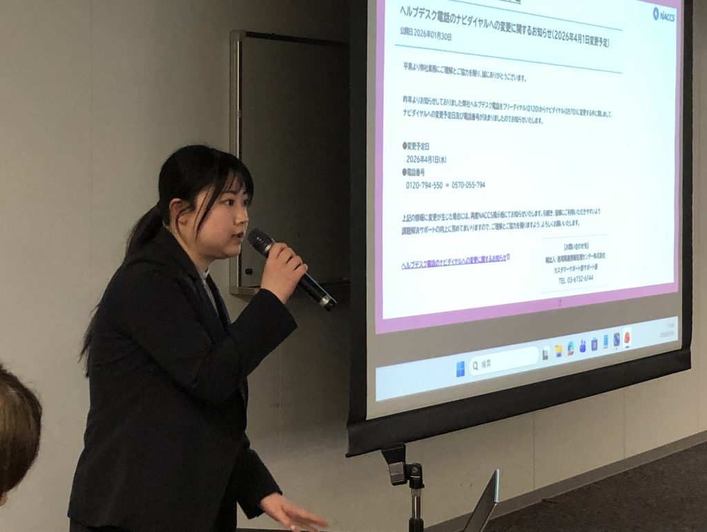 続く第三部では、NACCS九州事務所の小笠原氏から、ヘルプデスク電話のナビダイヤルへの移行、便利機能としてNACCS掲示板の見方、チャットボットによるサポート、AIを利用したNACCS掲示板情報の検索方法、虎の巻シリーズ、第7次NACCSから追加されたCSN(貨物状況通知予約登録)についてなどの説明が行われました。