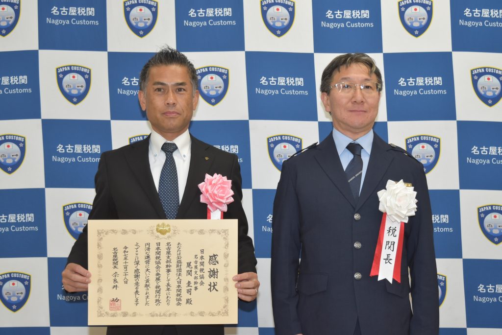 尾関幹事は、平成30年6月に当支部幹事(役員)に就任されて以来、今日に至るまでの約7年間にわたり、関税制度に係る諸手続の改善に関する提言を行うとともに、税関と民間事業者との調整の主導的役割を担うなど税関業務の円滑な運営に尽力し、その功績が認められ、名古屋税関から表彰されたものです。