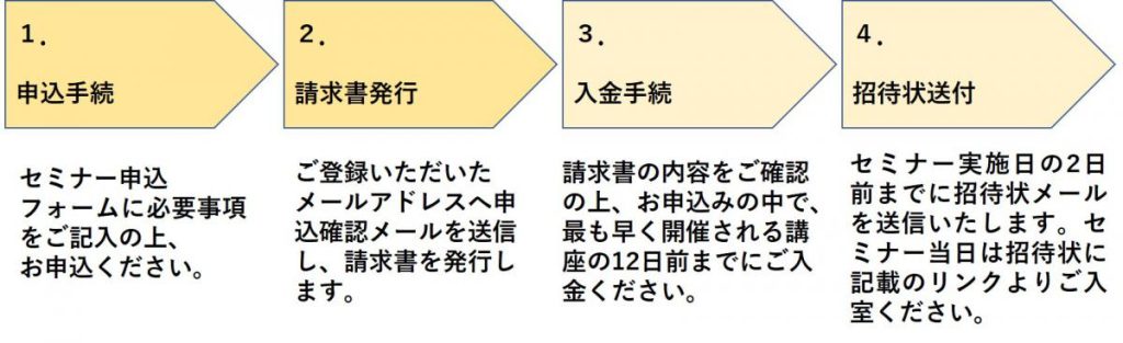 - Zoom招待状はセミナー2日前までに送付いたします。また、当日は開始10分前より開室いたします。