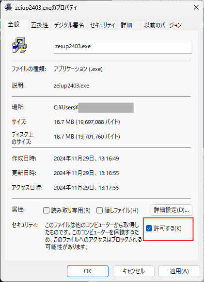 | 2. 次にダウンロードした「zeiup24●●.exe」ファイルをダブルクリックして下さい([スタート]-[ファイル名を指定して実行]でも可)。 ※以下の画面が表示される場合は、「詳細情報」をクリックした後、「実行」をクリックして下さい。 ![]() ※ダブルクリックしてもexeファイルが起動しない場合、プロパティをご確認下さい(セキュリティの「許可する」を✓)。 ![]() |